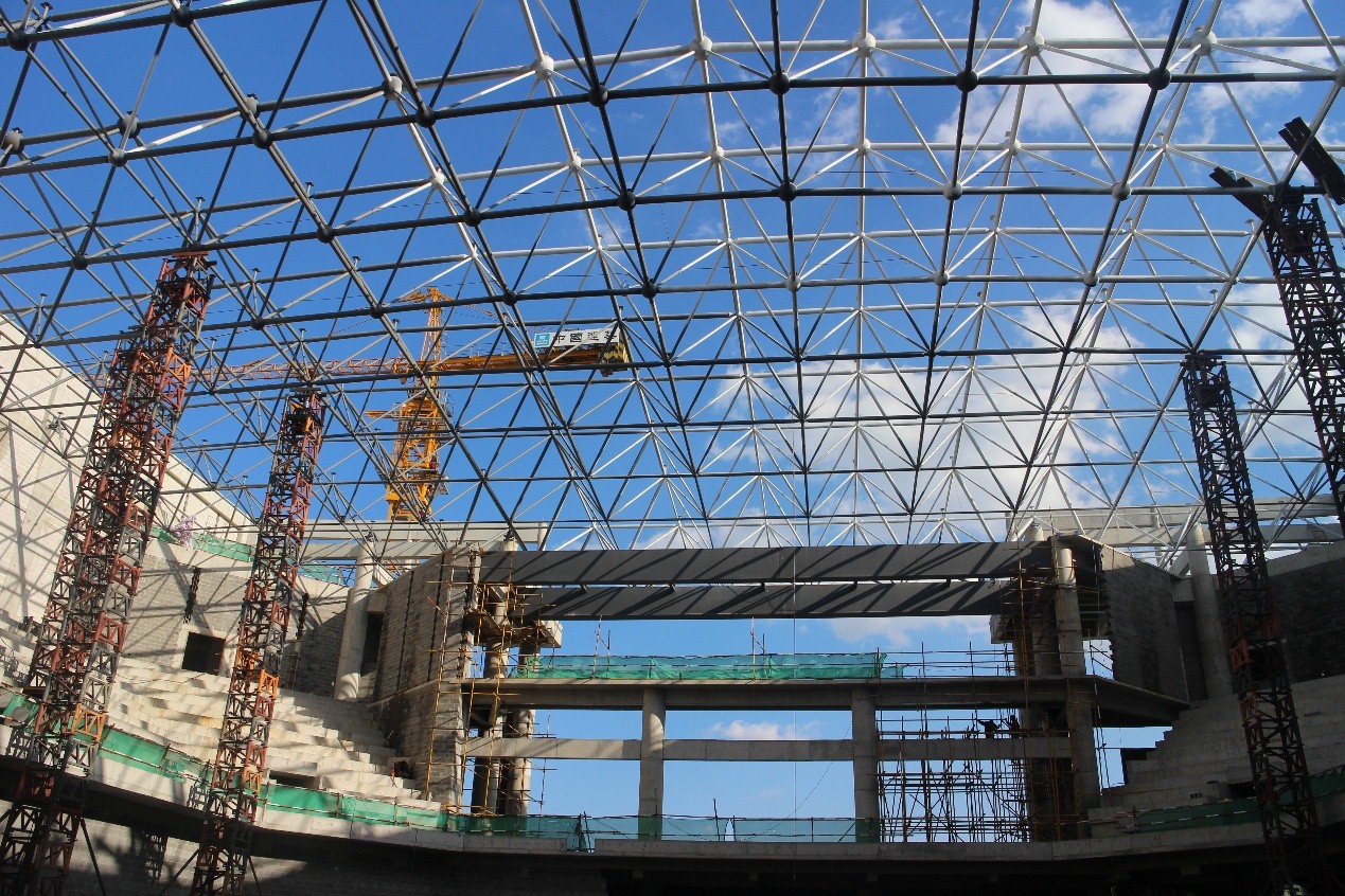屋面太阳能基础及零星结构施工完成。抹灰完成20%;钢结构面漆封样、钢结构网架吊装完成;防火涂料施工完成95%;幕墙南、北立面龙骨安装完成60%;雨水管完成10%;排水立管完成50%;消防立管全部完成;三层喷淋干管完成10%;首层空调风管完成20%,四层空调风管完成30%;竖井排烟风管完成40%。