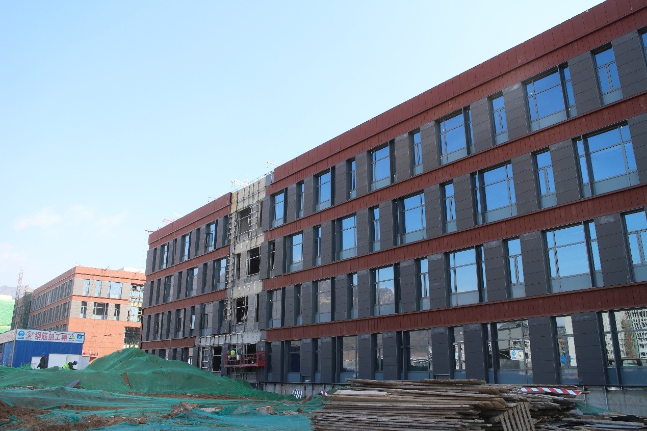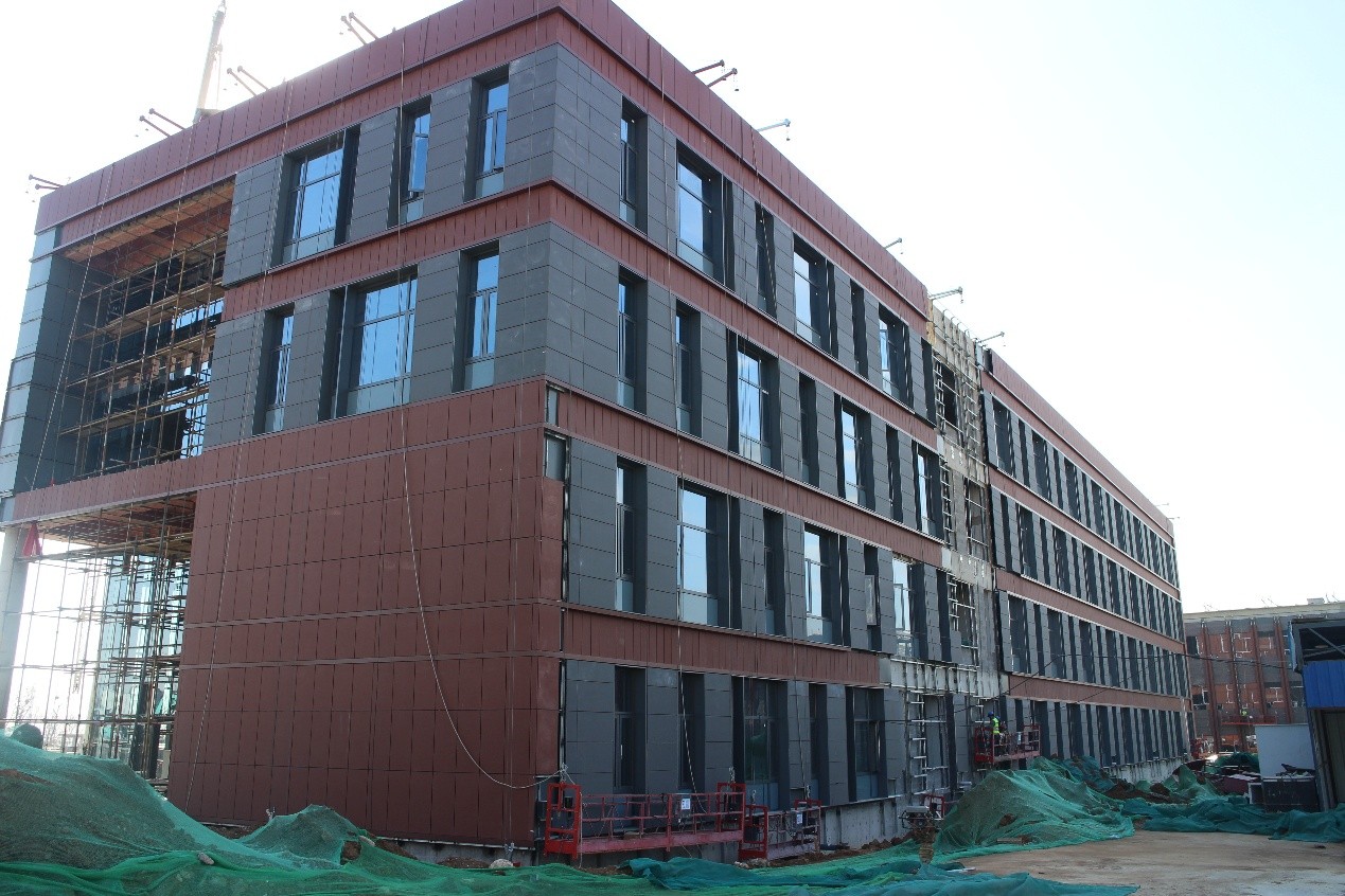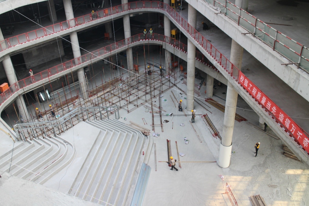 教学楼地面砖铺设完成30%,精装修吊顶龙骨完成50%;幕墙保温层完成90%,防水铝板完成82%,铝平板完成92%,压型铝板完成3%,铝窗框完成90%,窗玻璃完成90%,陶板完成47%,玻璃幕墙完成90%
