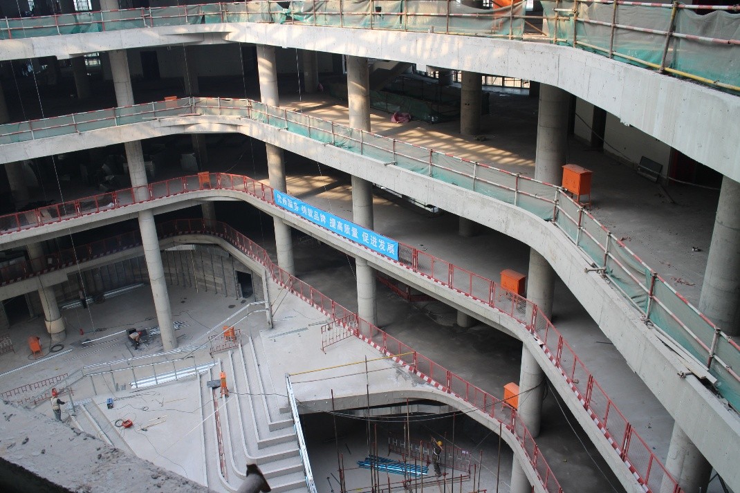 图书馆中庭大楼梯台阶基层骨架焊制完成80%,中庭玻璃栏板样板安装完毕,一层四区五区木纹转印铝板墙面基层开始安装,1-2层电梯厅基层钢架焊制开始安装;地下室耐磨地面浇筑完成40%,地上轻集料混凝土收边收尾完成60%,四层房间主龙骨完成,二层视听室墙面龙骨完成;幕墙一~五面防水铝板及玻璃安装完成90%,六面玻璃及防水铝板完成85%,吊顶铝板龙骨完成20%,二面、四面陶板安装完成20%;室外接驳污水管道完成,西侧、北侧给中水、消防水管道安装完成;消防一层气体灭火系统安装40%,一层消火栓管道收尾完成;地下室弱电桥架安装完成。