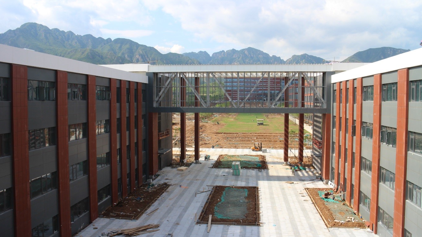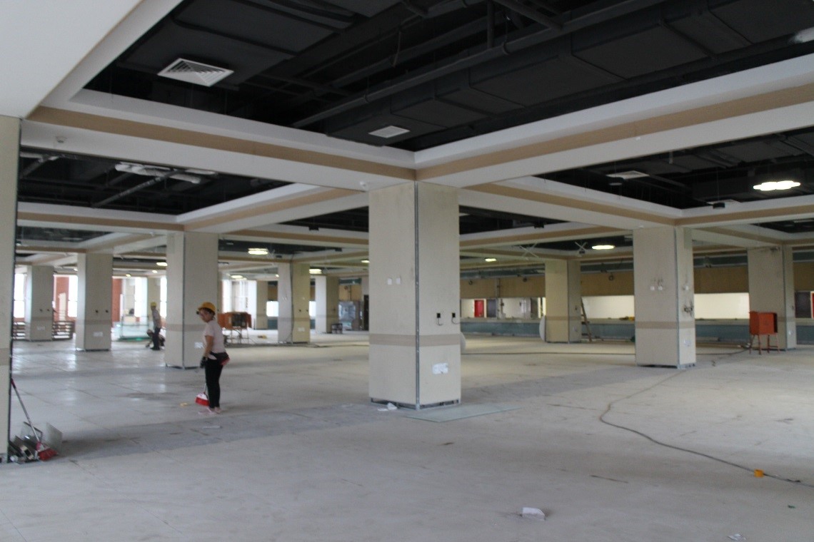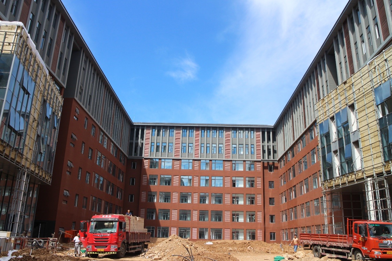 教学楼(除东端外)已经具备各种教学桌椅教学设备进场安装条件,多数教学设备已经进场安装;硅藻泥完成80%,室内空气检测已完成;录播教室正在做墙面样板;地砖完成80%,吊顶封板完成90%;动力、照明系统电缆敷设完成。