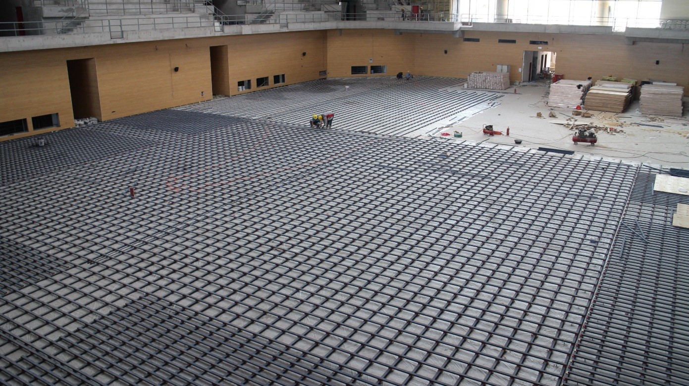 体育馆运动地板、固定及活动座椅、LED大屏已经开始进场安装;幕墙工程泳池采光顶铝板安装完成,东面施工电梯部位龙骨及岩棉玻璃完成,采光顶电动开启器安装完成,铝板完成;训练馆屋面贴砖施工完成,走廊地砖4层完成,铝方通训练馆门厅,走廊完成,主门厅铝板顶完成;游泳馆屋面贴砖施工完成95%,顶棚铝单板安装95%,墙面骨穿孔铝单板安装完成95%,清水及仿清水混凝土漆完成;游泳池地砖完成80%,侧面防水完成,游泳池台地砖完成95%;消防主机安装完毕,外线敷设完毕,单点调试完毕。