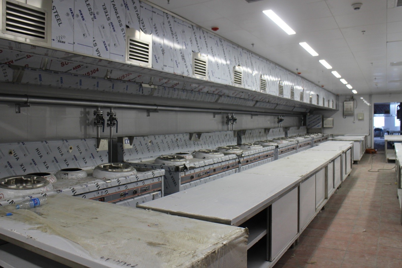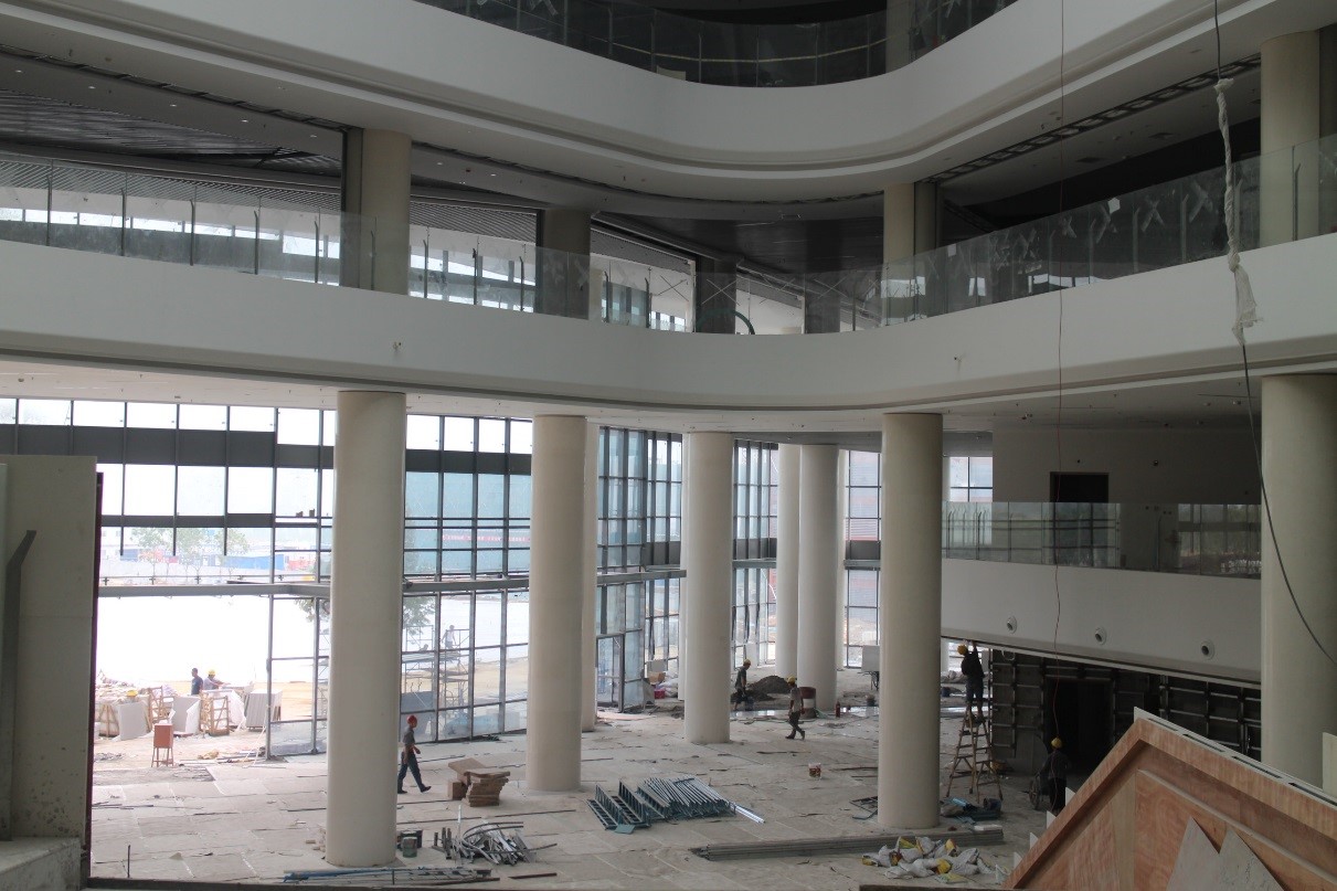 后勤服务楼顶层屋面铺装完成80%,质感涂料外立面完成,幕墙及外窗框安装95%,幕墙东立面外电梯处玻璃安装完成80%;2、3、4层走廊及大厅墙面腻子完成,防火门框安装完成,门扇安装90%,阿姆斯壮室内吊顶板正在吊装2至4层,完成90%,走廊吊顶二层完成,正在三层安装,大厅吊顶首、二、三、四层基本完成,二三四层室内涂料完成首遍。