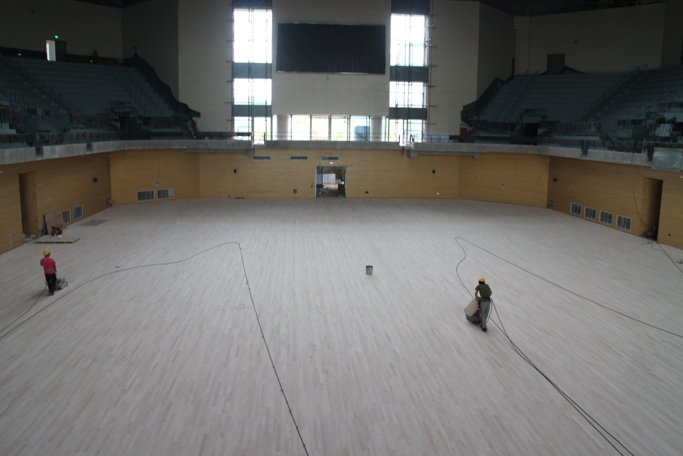 东、西主入口内幕墙铝板、玻璃安装完成,东西主入口屋顶檐口铝板安装完成50%,北面、南面下角收口铝板完成,补片玻璃已到场,安装完成60%,西面玻璃盒子灯槽安装完成,室内防火窗完成40%,电动开启进场开始安装;训练馆、比赛馆不锈钢地脚线安装完成50%,训练馆多功能厅墙面龙骨安装完成、顶棚龙骨安装完成、墙面装饰完成30%,卫生间门洞边收口、蹲便台收口完成100%,楼梯间、房间、走廊腻子、乳胶漆维修、找补完成100%,安装孔修补、描漆完成40% 。