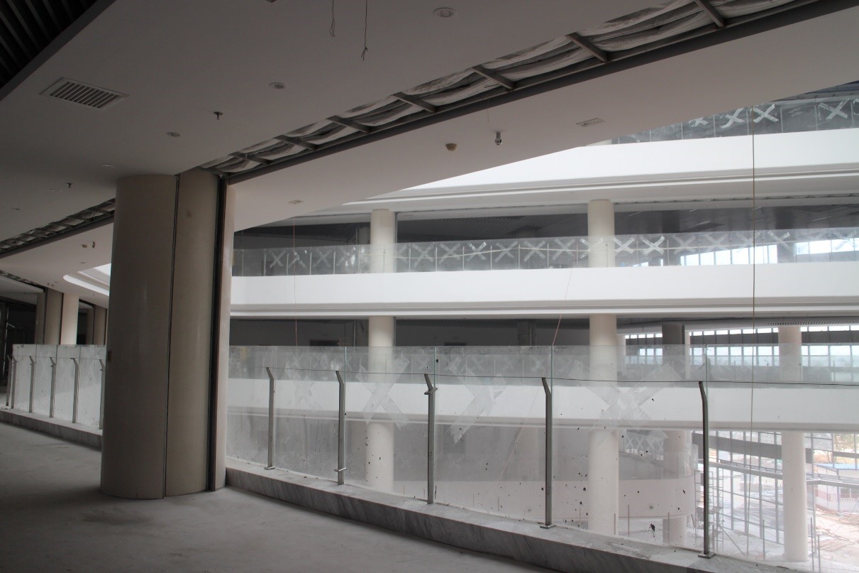 图书馆屋面装饰基本完成,外幕墙汽车坡道和勒脚石材基本完成;室内亚麻地面完成20%,硅金板方柱完成80%,铝方通吊顶完成80%;石材柱全部完成,地面灰姑娘石材完成80%,大堂、电梯厅吊顶完成70%,卫生间装修完成80%;人防工程完成,人防监督站已经完成现场检查,总包对提出的问题整改完成;室外景观花岗岩地面铺装完成80%;规划竣工测量、室内空气检测及系统节能照度检测完成。