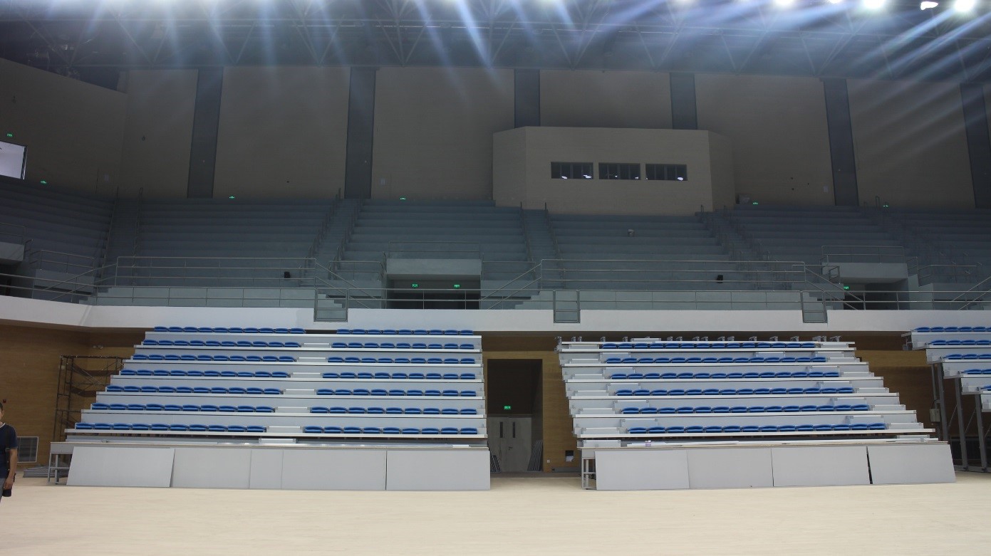 外幕墙基本完成;屋面、室内装饰、室外景观铺装基本完成;配电室工程达到竣工验收条件,外线电缆进场,2号分界室土建工程全部完成,配电设备安装完成,东侧电力井及管线完成;南门卫室土建工程完成50%;升旗系统加工订货完成;运动地板安装完成,LED大屏安装完成;规划竣工测量、节能照度检测、室内空气检测完成;防雷检测发现问题,总包单位正在整改。
