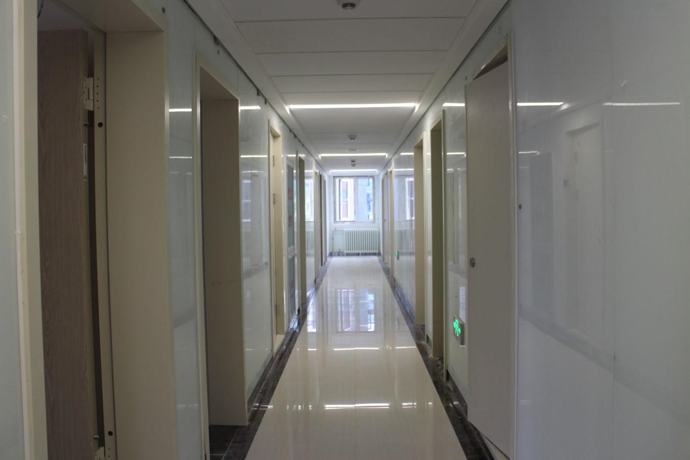 后勤服务楼室外装修、屋面工程、室内装饰工程基本完成;人防工程除设计变更新增四个门外完成;DR室防护及内装完成;室内空气检测、节能照度检测完成。