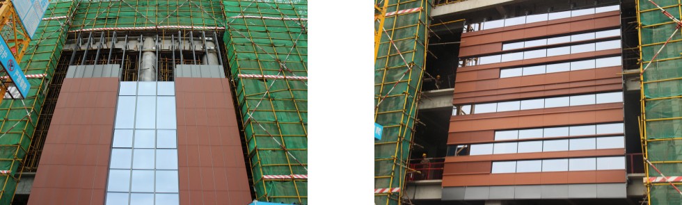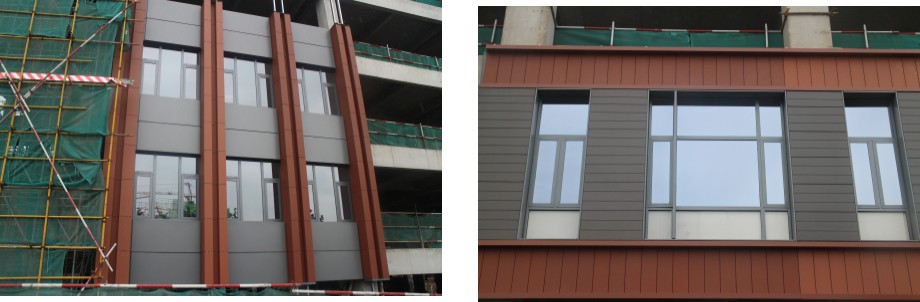 新校区四个主要单体均采用陶板为主的幕墙体系,陶板是当今建筑界最新型的幕墙材料,具有环保、节能、防潮、隔音、透气、色泽丰富,持久如新,应用范围广等优点。